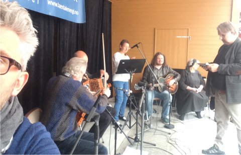 Høgemo and Innervik performing local tunes on Hardingfiddle and slåttetromme, together with Tom Karlsrud and Liv Ulvik, among others in Lærdal.